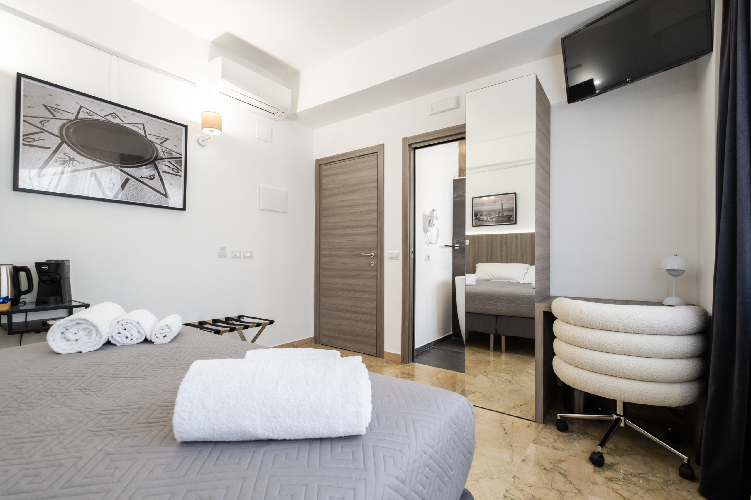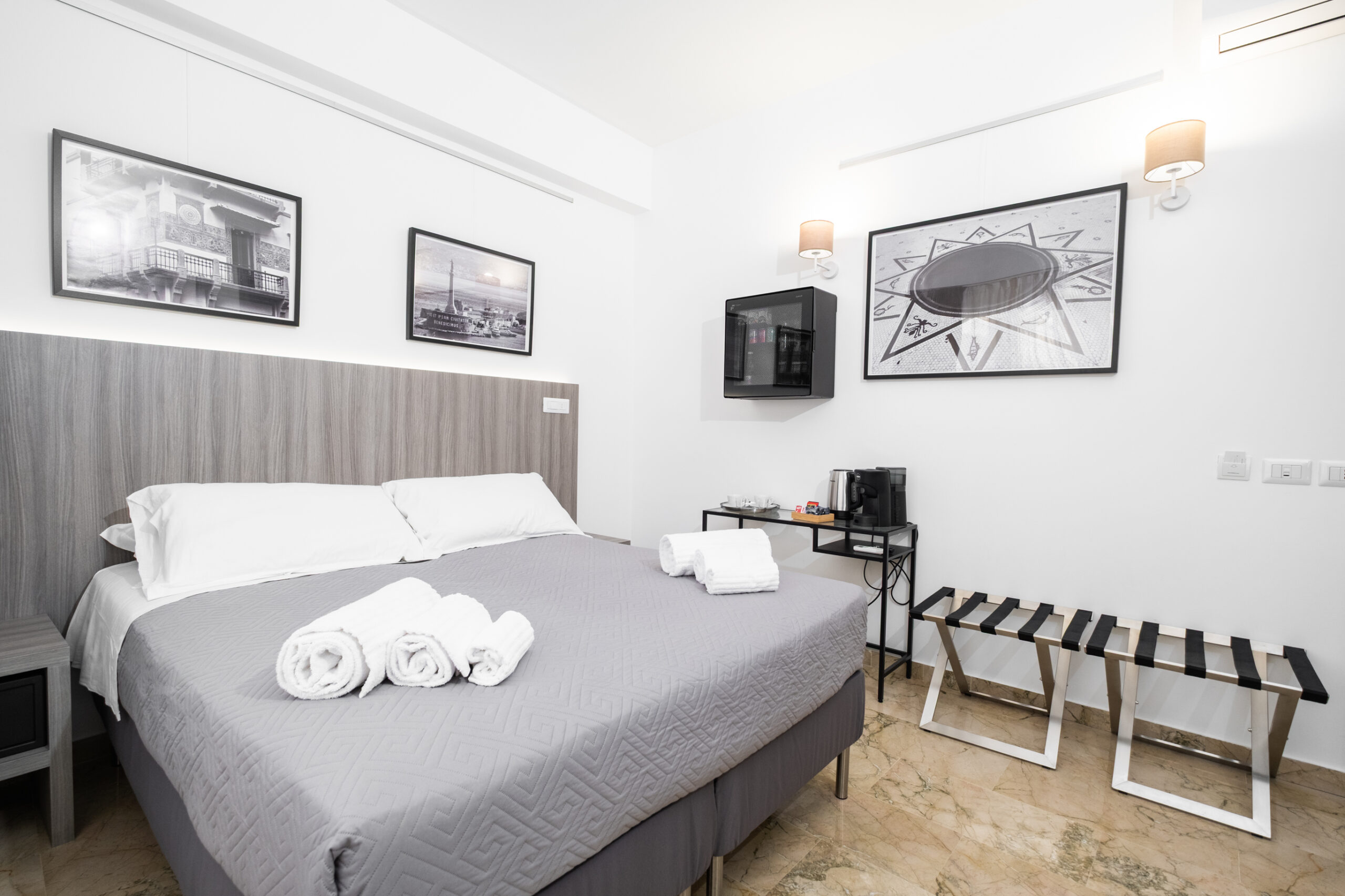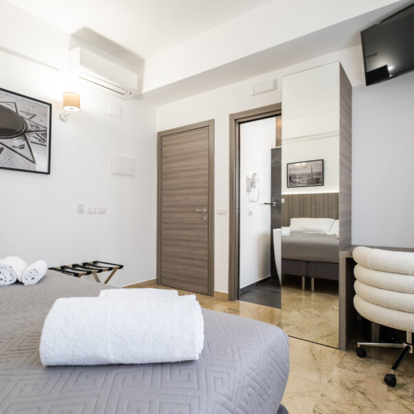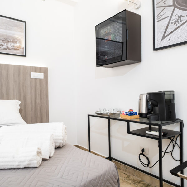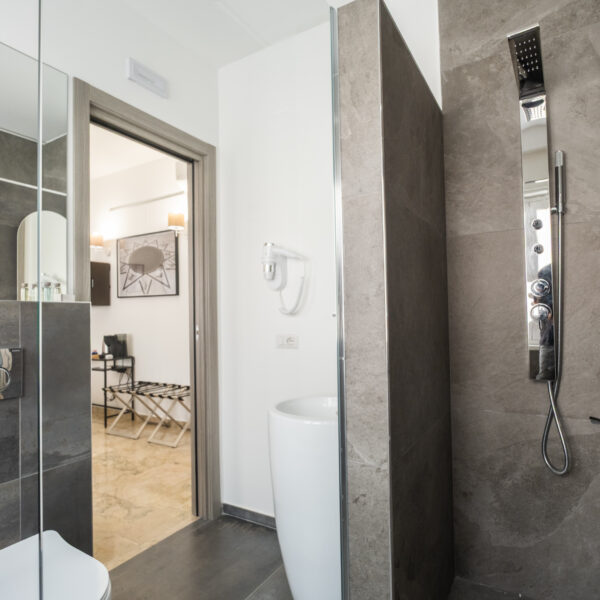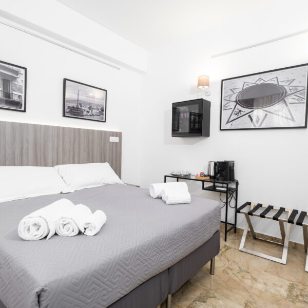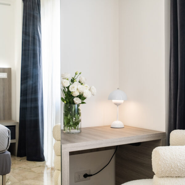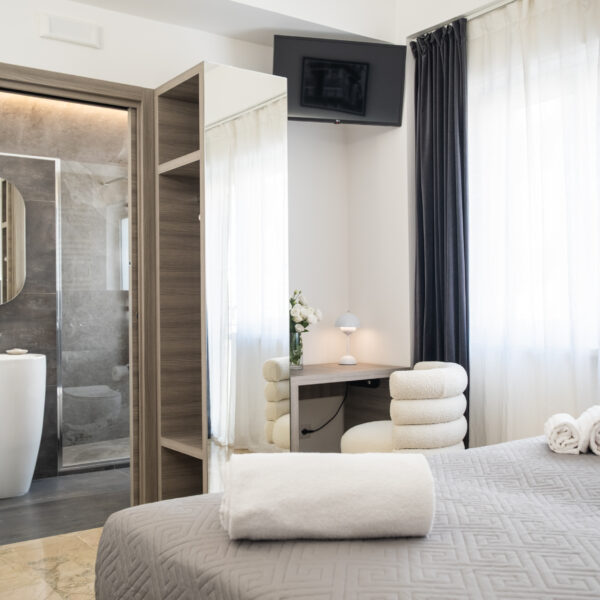 Gli arredi contemporanei, i toni neutri e le opere fotografiche in esposizione creano un ambiente rilassante, perfetto per coppie, ospiti business o viaggiatori che cercano un livello superiore rispetto a una camera standard.