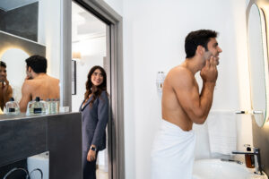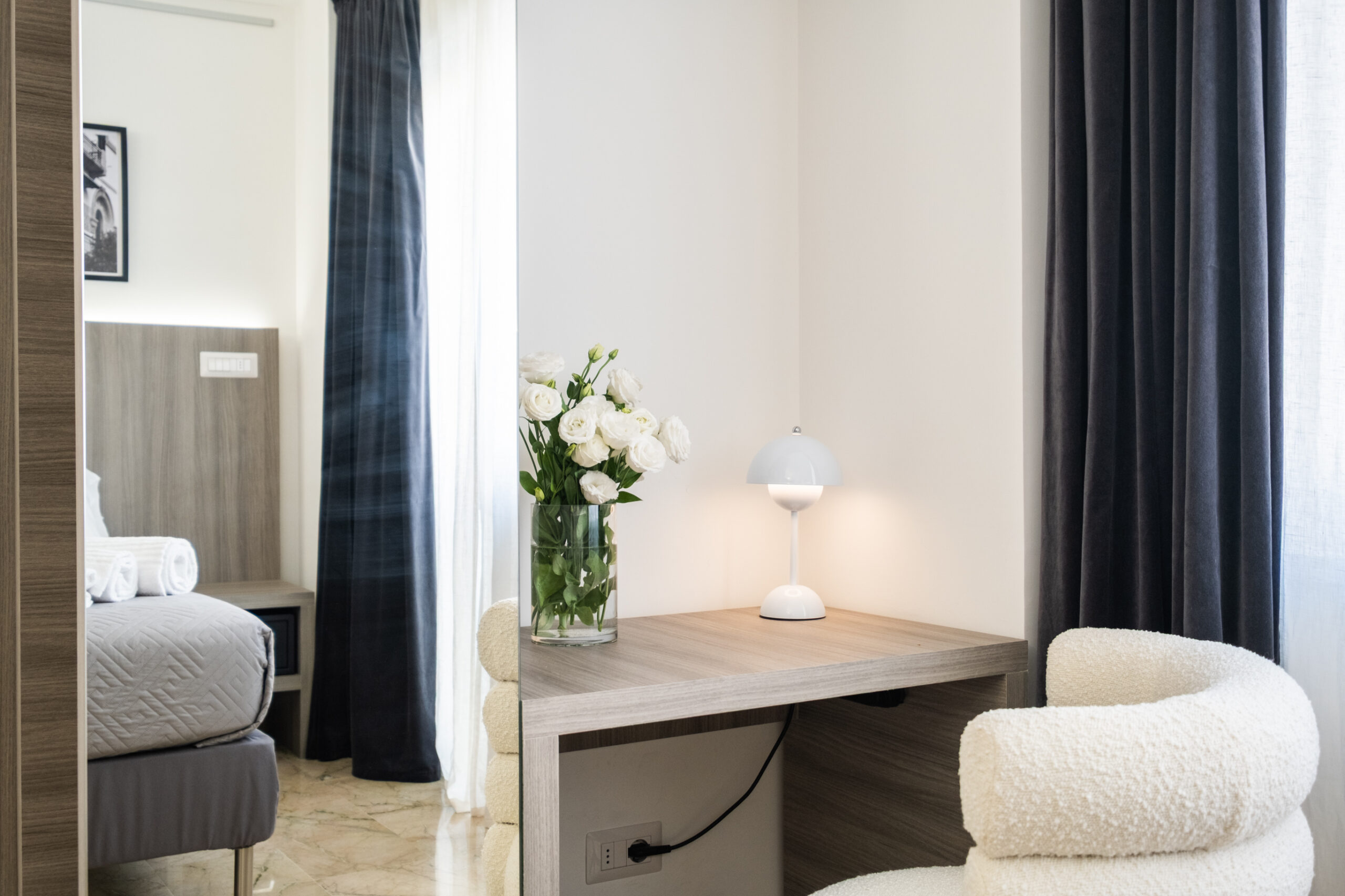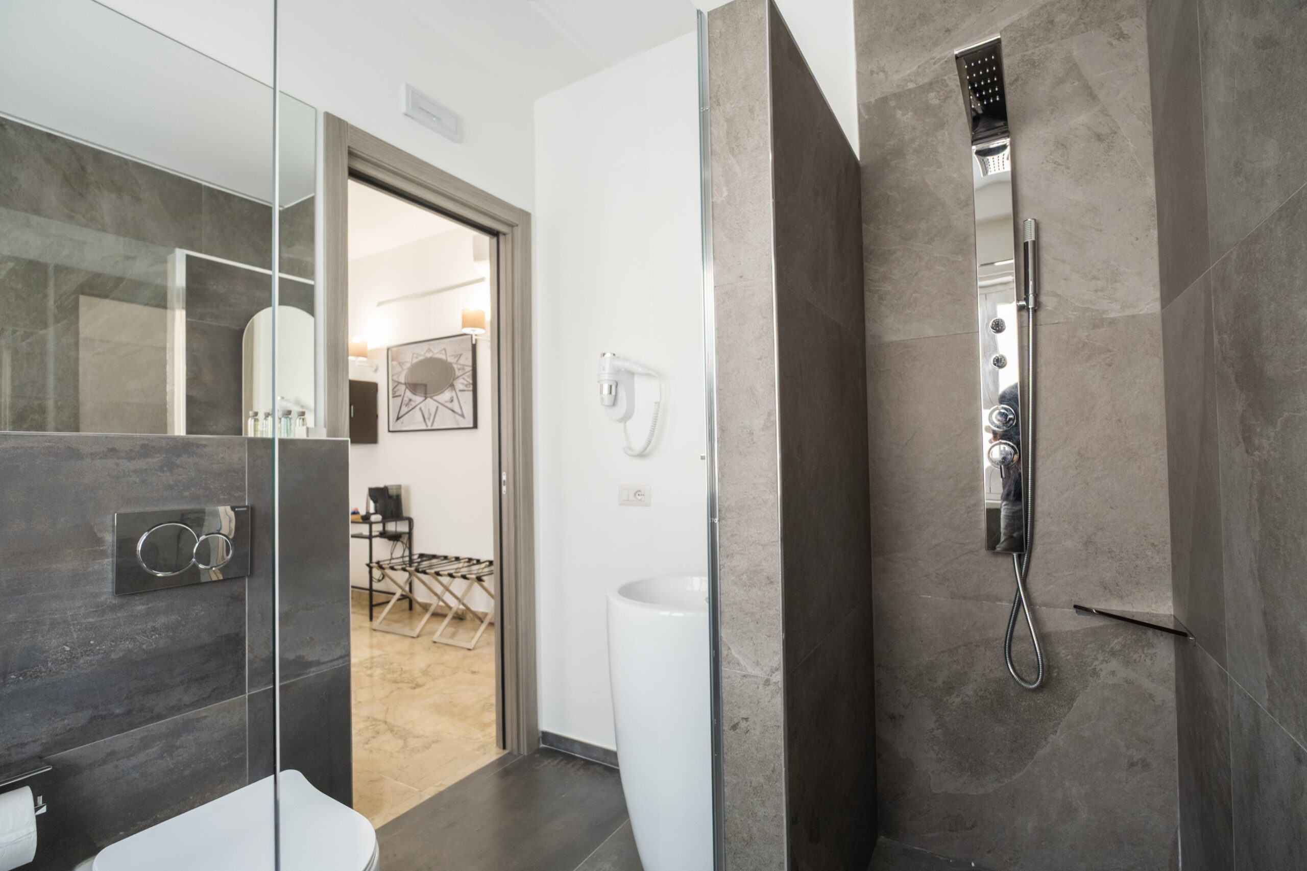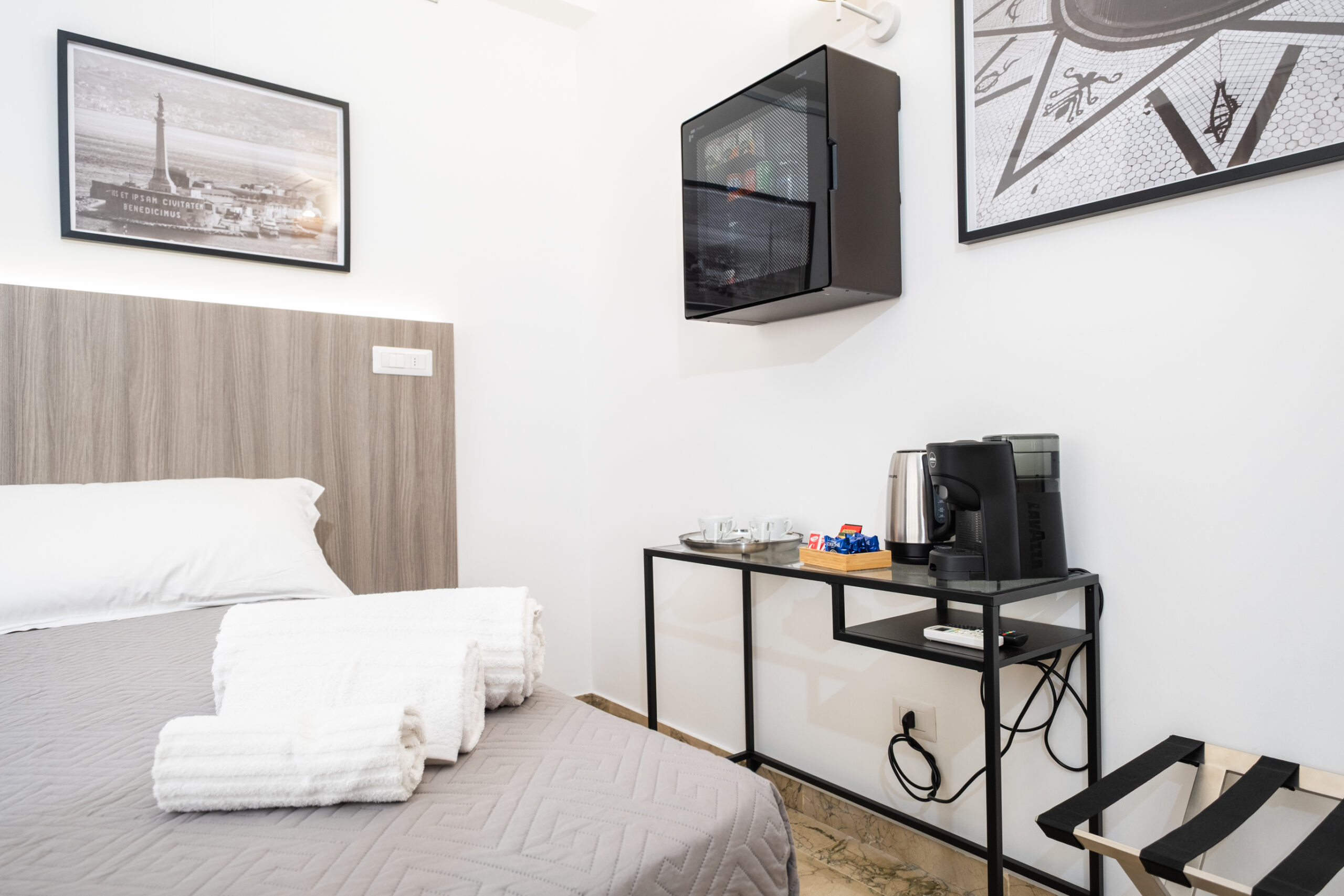 Gli arredi contemporanei, i toni neutri e le opere fotografiche in esposizione creano un ambiente rilassante, perfetto per coppie, ospiti business o viaggiatori che cercano un livello superiore rispetto a una camera standard.