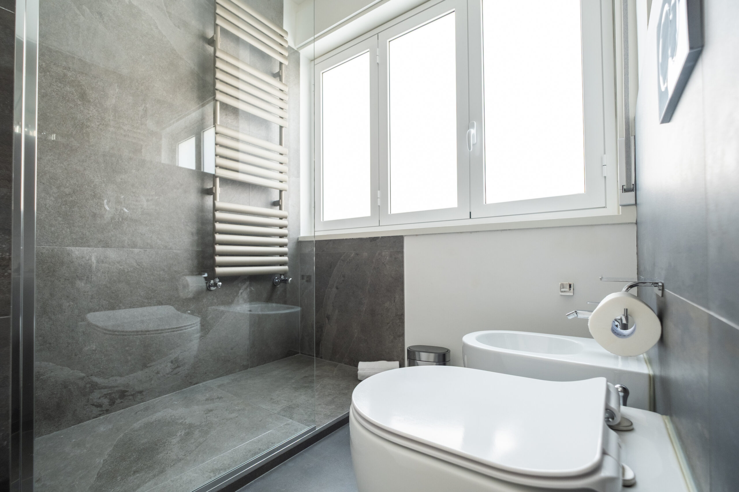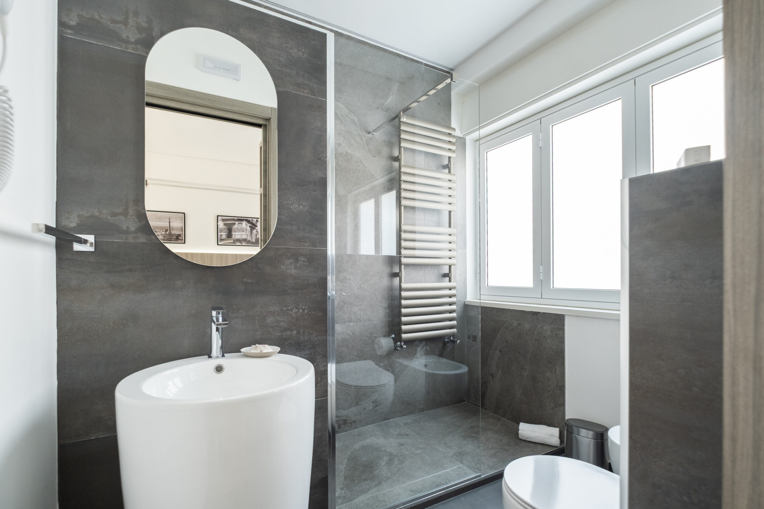 Bagno ampio e moderno con rivestimenti in gres scuro