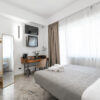 La stanza offre un equilibrio ideale tra estetica, funzionalità e accoglienza, con materiali moderni, pavimenti in marmo e dettagli eleganti.